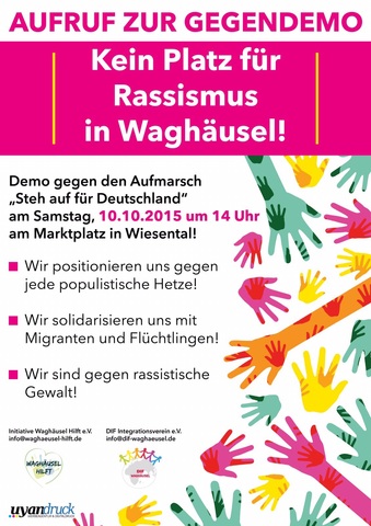 War den "Aufstehenden" schon vor Wochenfrist in Philippsburg kein schöner Marsch beschieden, so soll dies auch am 10. Oktober in Wiesental so sein. Die SPD Waghäusel folgt und unterstützt dabei den gemeinsamen Aufruf von Waghäusel hilft! und DIF, sich aktiv für ein weltoffenes Waghäusel einzusetzen.