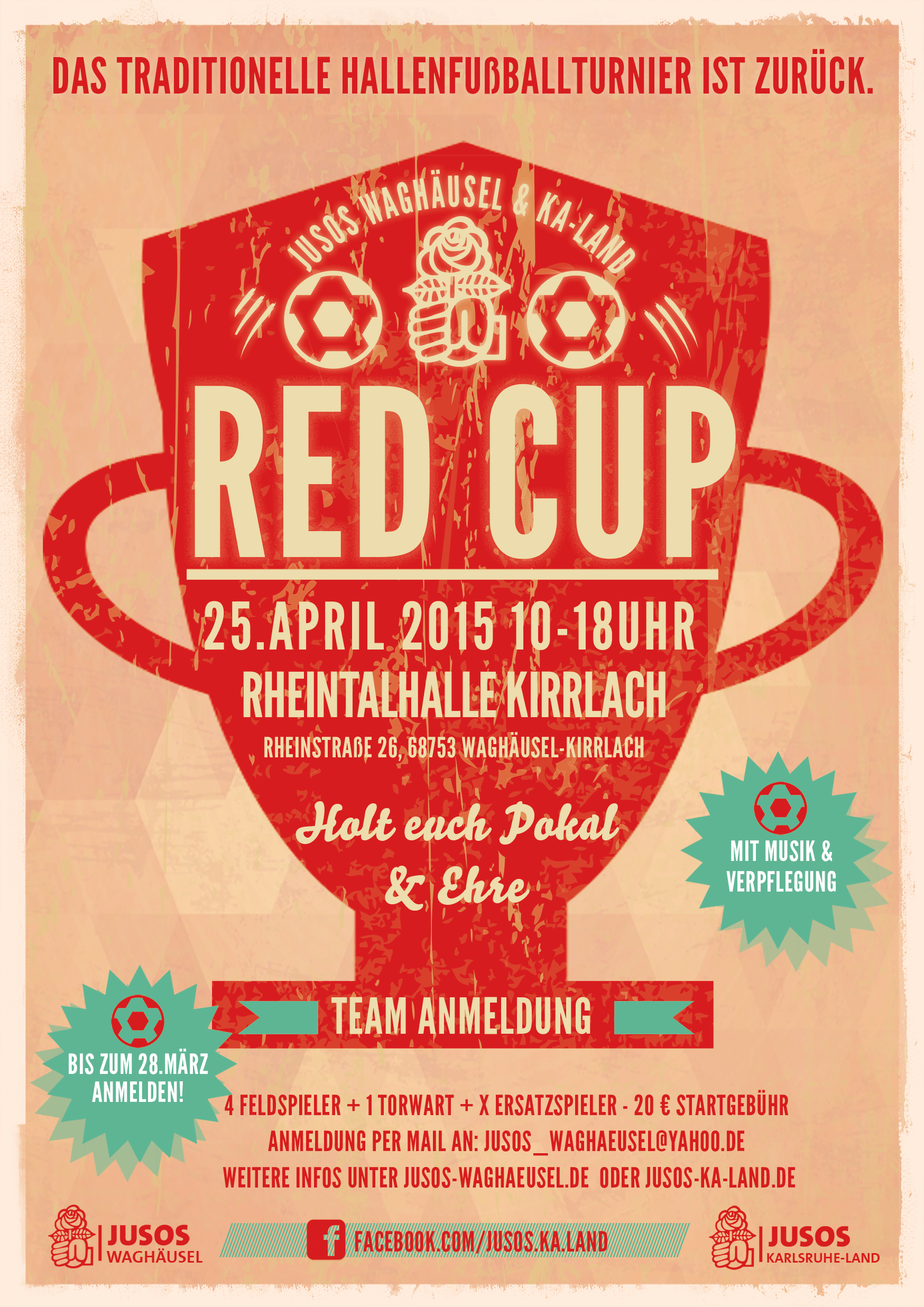 bereits zum 11.Mal findet am 25.April 2015 der RED CUP in Karlsruhe-Land statt. Nach einer kleineren Pause im Wahlkampfjahr 2014, ist das traditionelle Hallenfußballturnier wieder zurück. In Zusammenarbeit mit der Juso AG Waghäusel und dem Kreisverband Karlsruhe-Land wird das Turnier in diesem Jahr ausgetragen.