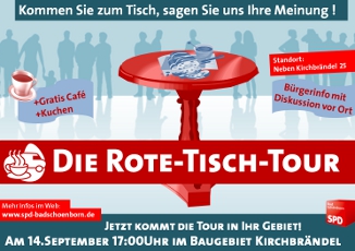 Mit der Roten Tisch Tour, welche bereits Ende 2009 an den Start ging will der SPD Ortsverein eine neue Bürgerplattform aufbauen, in der wirklich jeder die Chance hat sein Anliegen vorzutragen. Andere Parteien schreiben sich „Nah bei den Menschen“ nur auf das Wahlplakat, die SPD dagegen will immer für die Bürgerinnen und Bürger ansprechbar sein und nicht nur kurz bevor eine Wahl ansteht. In der Kommunalpolitik fehlt es heutzutage oftmals an Dialogen mit den MitbürgerInnen. Wir steuern mit dieser Aktion dagegen und suchen den Dialog!