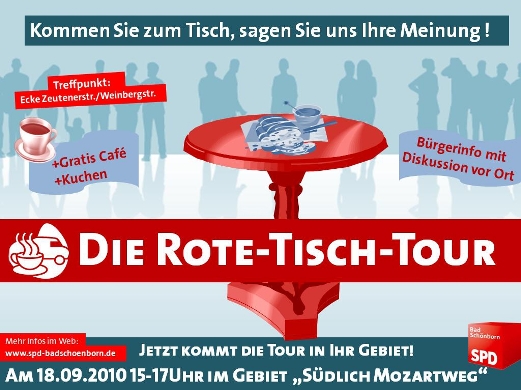 Geben Sie sich einen Ruck und kommen Sie zum Roten Tisch, wir freuen uns auf ein kleines Gespräch ganz ohne Wahlkampfhintergrund.