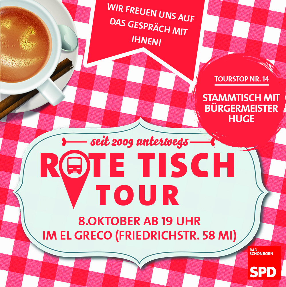 Der Rote Tisch geht weiter auf Tour. Seit 2009 ist der Rote Tisch nun in Bad Schönborn unterwegs. Hier haben wir mit vielen Mitbürgerinnen und Mitbürgern über ihre Themen sprechen können und deren Anliegen mitgenommen. Jetzt laden wir Sie zu unserem ersten Stammtisch im Rahmen dieser Dialog-Tour ein.