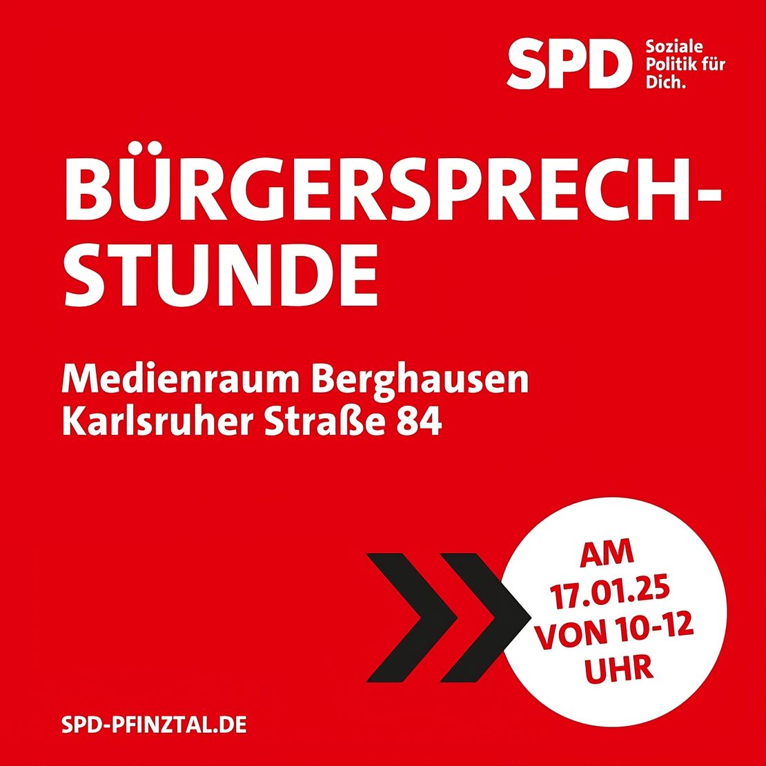 Am Samstag, 17. Januar 2026 sind wir mit unserer nächsten Bürgersprechstunde von 10 bis 12 Uhr im Medienraum in Berghausen, Karlsruher Str. 84 für Sie da.