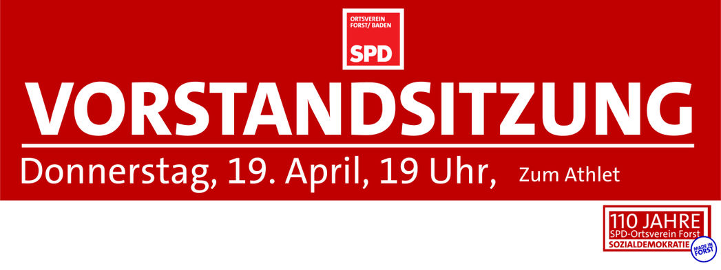Der SPD-Ortsverein lädt am Donnerstag, den 19. April, um 19 Uhr im Nebenzimmer des Restaurants "Zum Athlet" zur Vorstandsitzung 3/18 ein.
