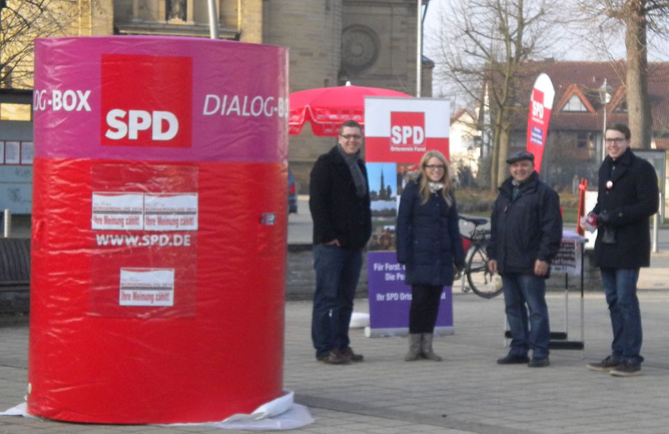 Am Samstag, den 8. März fand auf dem Forster Marktplatz der 1. Forster Bürgerdialog statt. Hier haben alle Mitbürgerinnen und Mitbürger die Möglichkeit Ihre Wünsche, Ideen und Anregungen für eine moderne und forschrittliche Forster Heimat in die unsere SPD-Dialog-Box zu werfen.