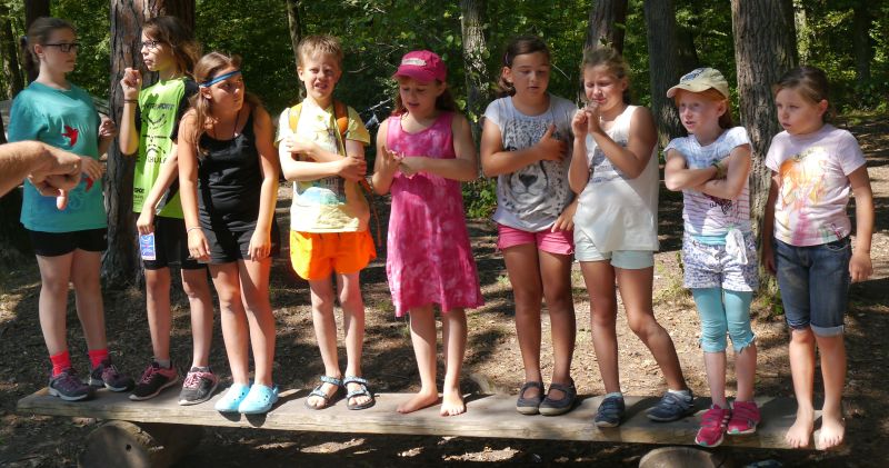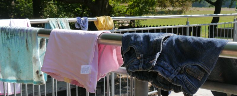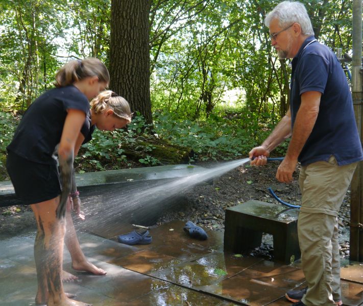 Nach mehreren Durchgängen auf dem Barfußpfad und einigen Spielen mussten vor dem Aufbruch eine "Grobsäuberung" mittels Wasserschlauch durchgeführt, alle zum Trocknen aufgehängten Kleidungsstücke wieder ihren Besitzern zugeordnet werden und falsch eingepackte Handtücher mussten den Weg in den richtigen Rucksack finden. Das geschah alles mit viel Gelächter.