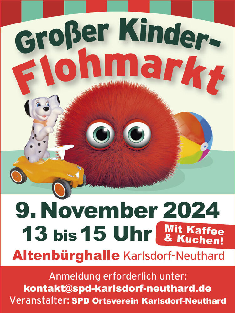 Die Tage werden spürbar kürzer. Das Gute daran ist, dass dann bald unser großer Kinderflohmarkt stattfindet. In diesem Jahr sehen wir uns am 9. November von 13 - 15 Uhr wieder in der Altenbürghalle. Die Tische (ca. 180 x 80 cm) werden gestellt und kosten wie im Vorjahr 7 €. Infos und Anmeldung ab sofort unter kontakt@spd-karlsdorf-neuthard.de.