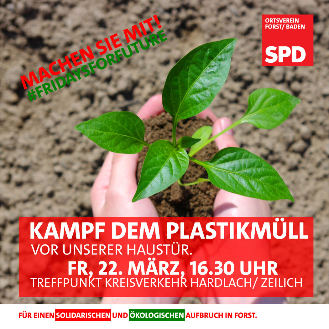 Die Forster Sozialdemokratie wird am Freitag, 22. März, um 16.30 Uhr zwischen Forst und Bruchsal den Plastikmüll aufsammeln. "Jeden Tag wenn ich die Strecke von Forst nach Bruchsal mit dem Fahrrad fahre ärgere ich mich über den vielen Müll", so ein Genosse. Der SPD-Ortsverein hat sich deshalb dazu entschieden, eine Müllsammel-Aktion zu starten. "Im Spätjahr findet in Forst bereits die Gemarkungsputzaktion statt, bei der zahlreiche Vereine, Gruppierungen sowie Bürgerinnen und Bürger sich beteiligen. Dadurch das im Frühjahr kein Laub den Müll bedeckt, kommt nun der Plastikmüll zum Vorschein. Zur "Frühjahrsputzaktion" sind alle Bürgerinnen und Bürger herzlich eingeladen. Treffpunkt ist beim Kreisverkehr an den Baugebieten Hardlach und Zeilich.