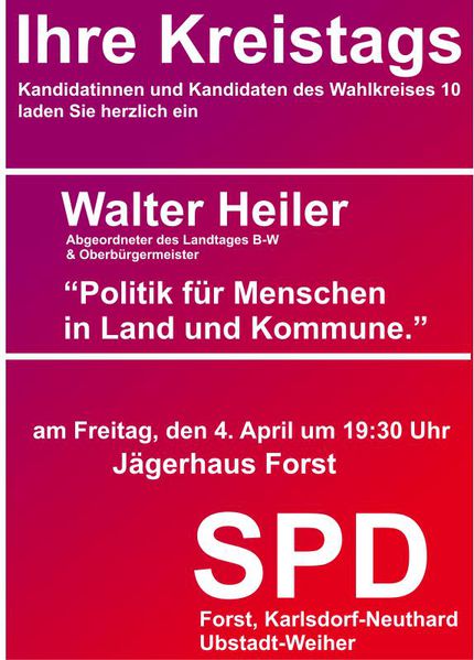 Walter Heiler wird über wichtige kommunalpolitische Themen referieren und auch über aktuelle Themen der grün-roten Landesregierung sprechen. Zugleich ist es Wahlkampfauftakt der Kandidatinnen und Kandidaten der SPD-Ortsvereine Forst, Karlsdorf-Neuthard und Ubstadt-Weiher. Alle Mitglieder und Freunde haben die Möglichkeit, bei einer Vorstellungsrunde die Kandidatinnen und Kandidaten für den Kreistag persönlich im Jägerhaus kennenzulernen.