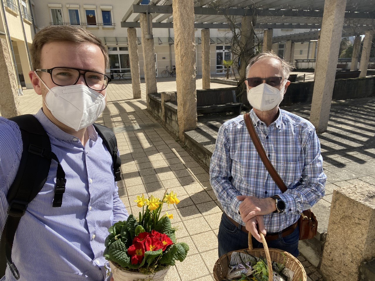 Das traditionelle SPD-Ostercafé im Forster Seniorenheim konnte aufgrund der Pandemie erneut nicht stattfinden. SPD-Mitglied Gerhard Gleixner und Ortsvereinsvorsitzender Christian Holzer brachten deshalb einen kleinen Ostergruß ins Seniorenheim: Einen farbigen Oster-Blumenschmuck für jedes Stockwerk und einen osterlichen Anhänger aus Holz für jede BewohnerIn, die von Gerhard Gleixner und Ingrid Helmling in Handarbeit selbst hergestellt wurden - ein ganz herzliches Dankeschön an unsere beiden engagierten Mitglieder. Pflegedienstleiterin Frau Däschner nahm den Ostergruß und die guten Wünsche zum anstehenden Fest entgegen. Die SPD bedankte sich stellvertretend bei Frau Däschner für die wichtige und wertvolle Arbeit der Pflegekräfte, gerade in dieser fordernden Zeit.