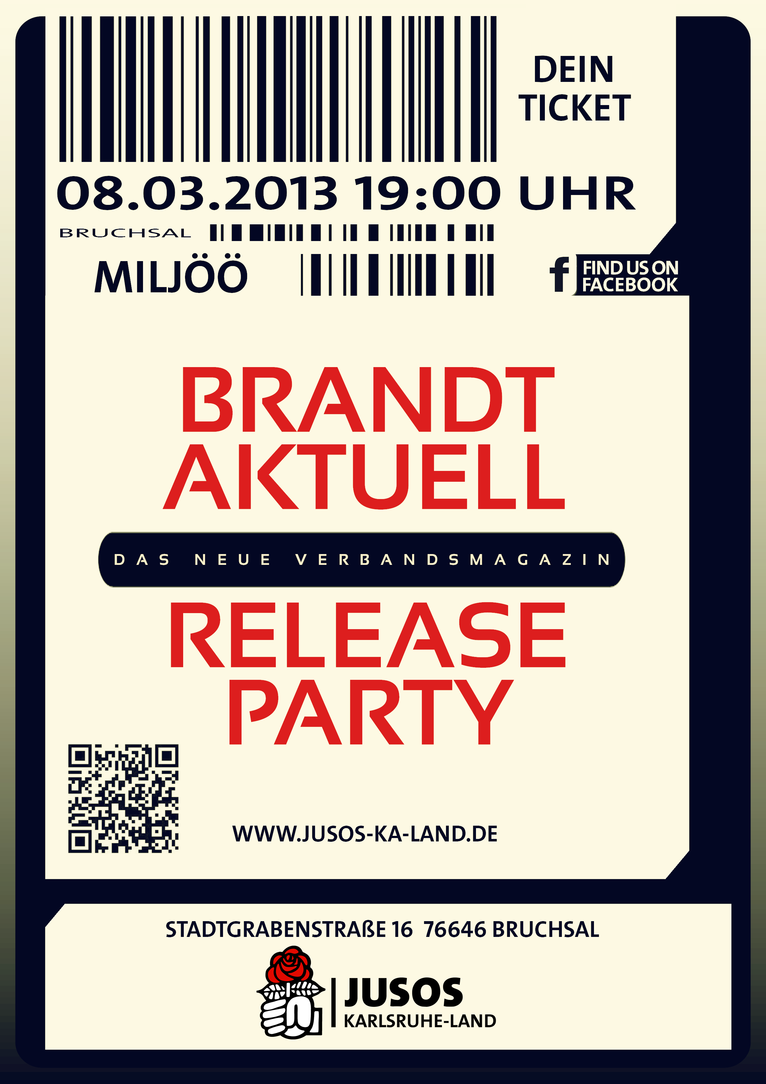 Das Magazin ist ein neuer Schritt in Richtung unseres anvisierten Ziels, einen offenen Austausch aller Jusos im Kreis zu ermöglichen. BrandtAktuell ist kein Projekt der Redaktion, sondern ein Mitmachportal – deswegen wollen wir auch alle zusammen feiern. Gründe gibt’s genug: Die erste Ausgabe hat viele Schreiber*innen und Künstler*innen motiviert, ein mehr als 36 Seiten starkes Heft zusammenzustellen, das wir Euch nun stolz präsentieren wollen. Wir feiern insgeheim also uns alle: Unsere Zusammenarbeit, unsere Kreativität und unsere AGen, die sich mit diesem Format ab sofort noch mehr über die Arbeit der anderen informieren und austauschen können. Und ein buntes Heft voll mit Ideen & Fotos, Berichten und Informationen verlangt nach einer ebenso bunten Party! Dafür haben wir einen eigenen Raum extra für Euch reserviert. Erreichen könnt ihr das Miljöö bequem per Bahn, es befindet sich nicht weit vom Bahnhof Bruchsal. Auf alle Gäste wartet ein besonderes Geschenk: Die limitierte Druckausgabe des neuen Magazins.