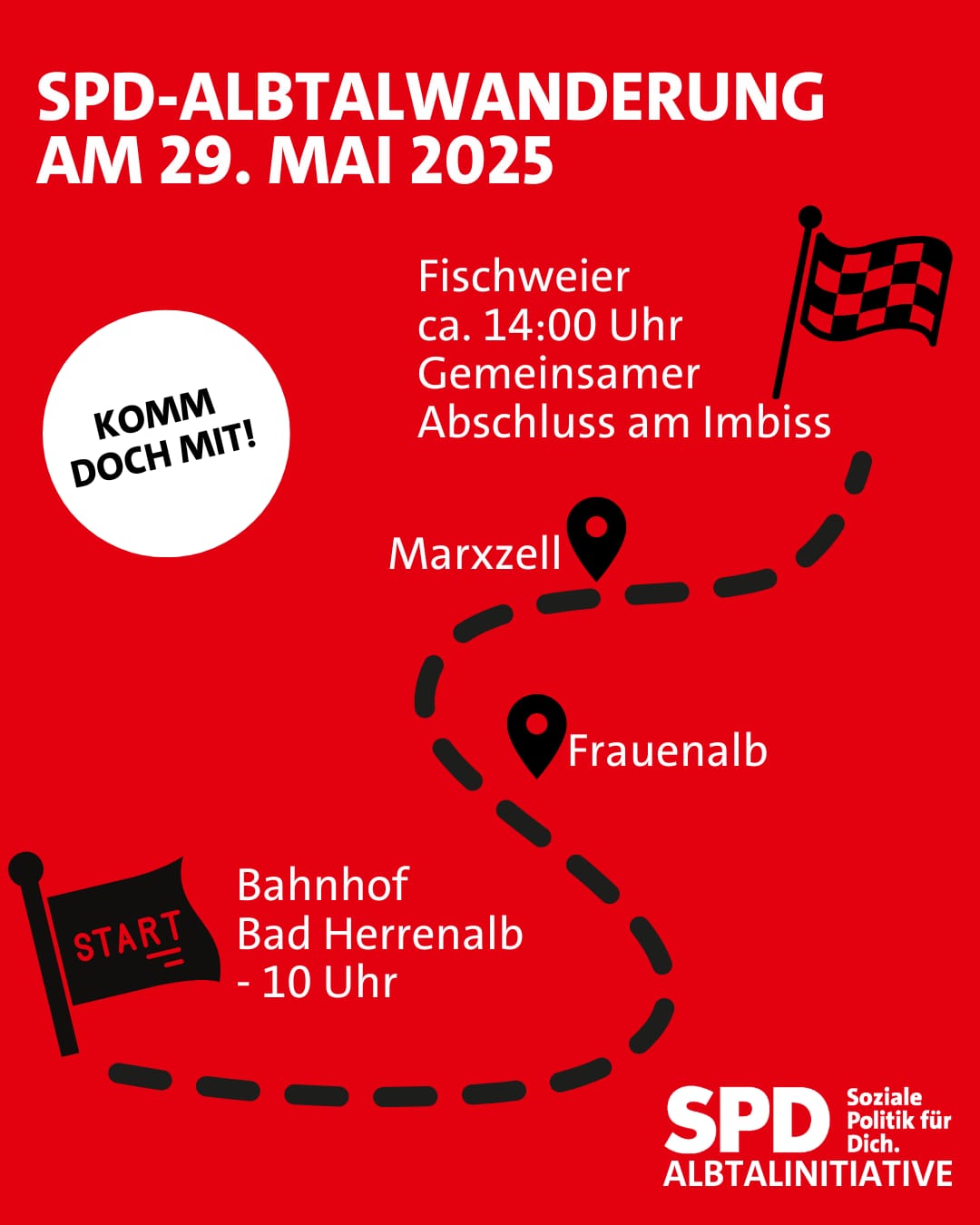 Wenn du Lust hast, dich mit uns gemeinsam auf den Weg zu machen, dann melde dich gerne unter folgender Emailadresse an: spd.albtal@gmail.com.