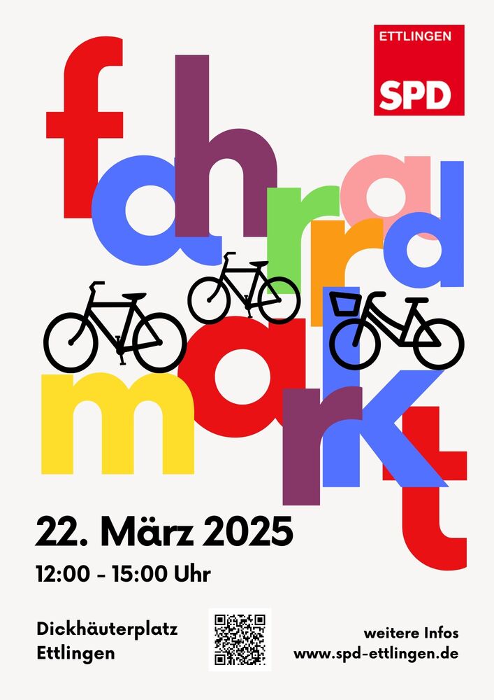 Unser Fahrradmarkt findet am Samstag, den 22. März 2025 von 12 Uhr bis 15 Uhr auf dem Dickhäuterplatz in Ettlingen statt. (Bei schlechtem Wetter - Regen, Schnee, Wind - verlegen wir den Termin auf den 5. April 2025 und teilen dies hier und auf unseren Social-Media-Kanälen mit.)