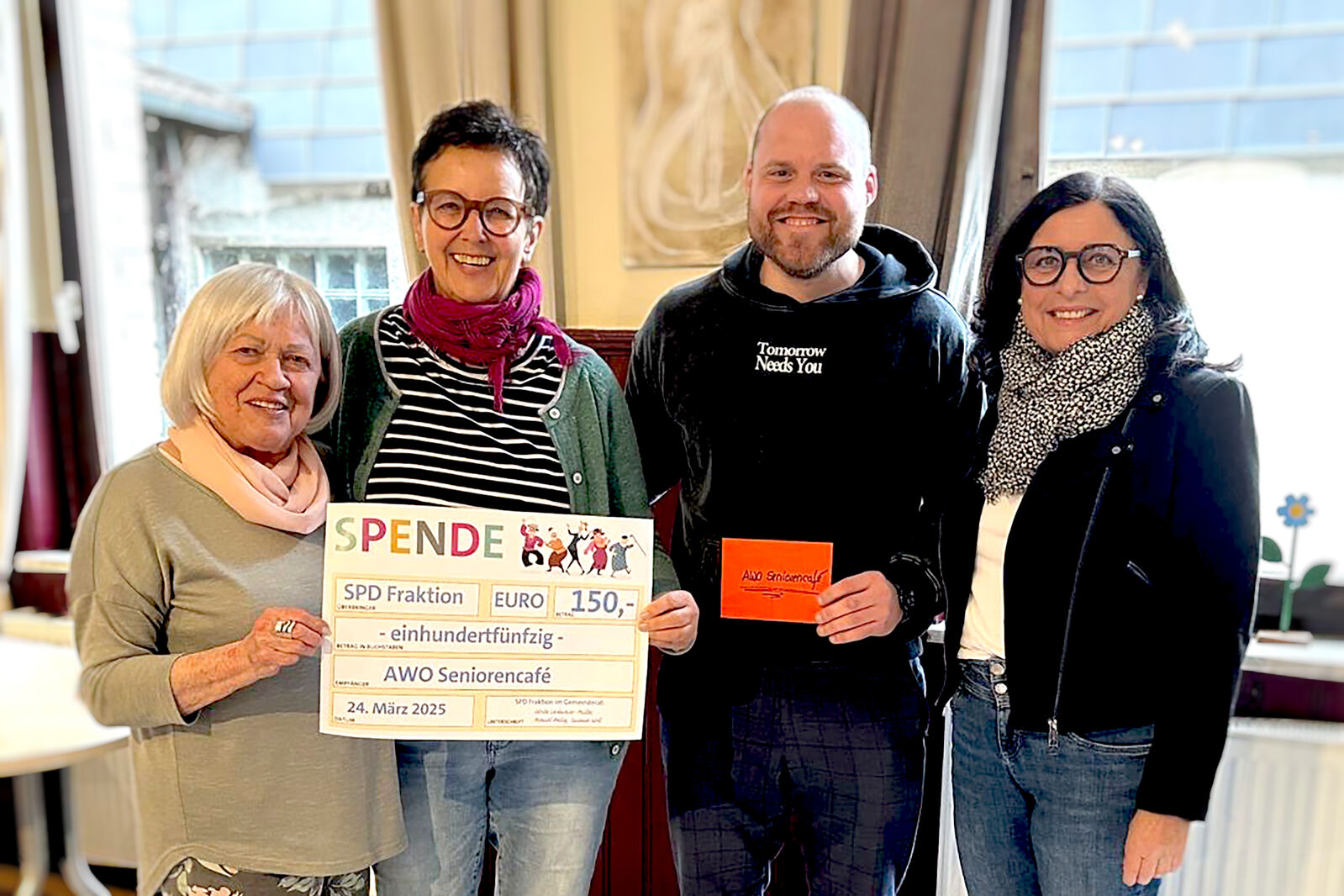 In diesem Sinne ist es nur verständlich, dass wir als SPD-Fraktion unsere erste Spende aus dem Weihnachtssitzungsgeld an das Seniorencafé der AWO übergaben. Uli Lechnauer-Müller, Manuel Heilig und Susanne Woll überreichten einen Scheck über 150 Euro an das Team um Sonja Herberger. Diese Spende wird es den rüstigen Seniorinnen ermöglichen, einen Ausflug in den Vogelpark zu finanzieren. Bei der Übergabe wurden sie mit großem Applaus empfangen, denn im Seniorencafé gilt nach wie vor: „Alles zum Selbstkostenpreis“ – Kaffee und Kuchen und ein Abendessen. Viele der Gäste freuen sich auf diesen geselligen Nachmittag alle zwei Wochen, an dem gesungen, gespielt und geratscht wird. Es ist uns eine Freude, diese wertvolle Arbeit zu unterstützen.