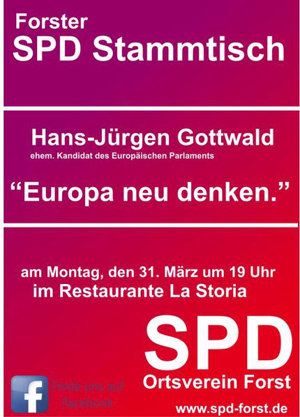 Am Montag, den 31. Mörz findet um 19 Uhr im Nebenzimmer des Restaurante La Storia der Forster SPD Stammtisch statt. Referant des Abends ist Hans-Jürgen Gottwald (ehem. Kandidat des Europäischen Parlaments). Er wird über das Thema "Europa neu denken" sprechen.