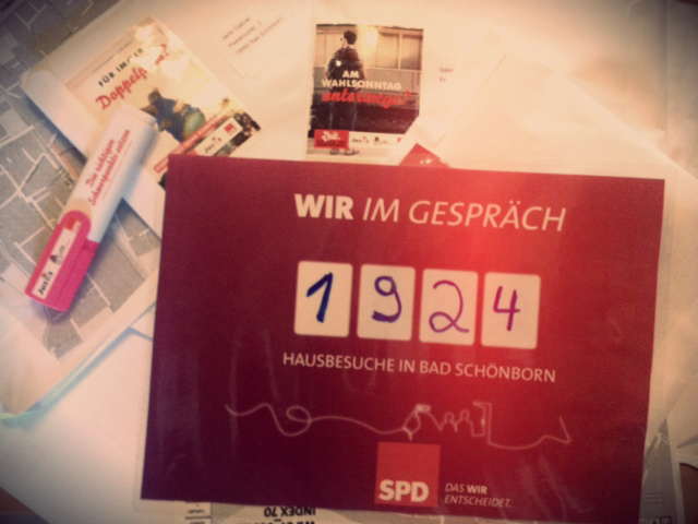Am vergangenen Montag waren in Bad Schönborn 1800 Haushalte erreicht – das Ziel von 2000 rückte näher. Parallel informieren die eifrigen Aktiven besonders Jugendliche über soziale Netzwerke. Viele Bürger und Bürgerinnen lobten die Tür-zu-Tür-Wahlkämpfer: „Toll! Das ist ja wie bei Obamas Wahlkampf in Amerika!“