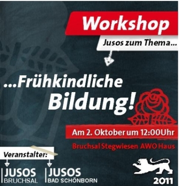 Am 02.10.2010 trafen sich die Jusos Bruchsal und die Jusos Bad Schönborn zu einem Workshop zum Thema frühkindliche Bildung im AWO-Haus in Bruchsal. Ziel war es, sich mit der Bedeutung der frühkindlichen Bildung genauer vertraut zu machen. Dazu befassten sich die Teilnehmer des Workshops zuerst in zwei Gruppen mit dem Begriff der Intelligenz und der Bedeutung der Kindergärten bzw. der Kindertagestätten für die frühkindliche Bildung. Anhand dieser Informationen wurde dann in gemeinsamer Arbeit eine Liste von Forderungen an das Bildungssystem aufgestellt, wobei hier neben einer Kindertagesstätten-/Kindergarten-Pflicht auch die Bedeutung der Sprachförderung betont wurde. „Die frühkindliche Bildung ist nicht nur ein wichtiger Grundstein für die Entwicklung der Kinder, sondern auch der Schlüssel zur Integration“, stellte Marko Vidakovic, Pressesprecher der Jusos Bruchsal, in diesem Zusammenhang fest.