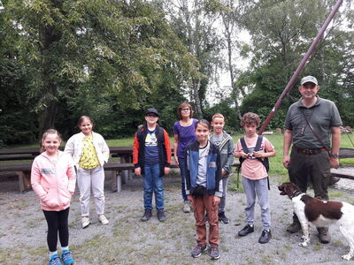 Gespannt lauschten die Kinder mit dem Stethoskop am Ohr am Stamm einer alten Buche, um den Saftstrom wahrzunehmen, den der Baum von den Wurzeln zur Krone befördert. „Das hört sich ja an wie ein Wasserfall“ stellt der 10-jährige Tim erstaunt fest.“ Bis zu 300 Liter Wasser am Tag, das entspricht ungefähr 400 Flaschen Sprudel, saugt die Buche im Sommer aus dem Waldboden“, erklärt Christian Feldmann und fügt an, dass es in diesem Jahr den Bäumen im Wald durch den vielen Ragen besser geht als in den trockenen Vorjahren. Aber auch in unserem Wald gibt es trockene, abgestorbene Bäume als Folge des Klimawandels.