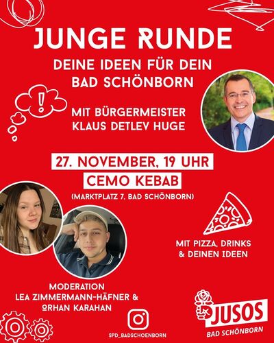 Jugendliche werden oft überhört – doch damit wollen die Jusos Bad Schönborn brechen und laden am 27. November ab 19 Uhr zur Jungen Runde im Cemo Kebab am Marktplatz Mingolsheim ein. „Wir freuen uns, dass unser Bürgermeister dabei sein wird und in den direkten Austausch mit jungen Menschen kommt”, so der Juso-Kampagnenbeauftragte Orhan Karahan. Gemeinsam sammeln die Jusos Ideen für Bad Schönborn, stellen Fragen und gehen in den offenen Austausch mit Bürgermeister Klaus Detlev Huge. Ihm ist der Austausch besonders wichtig, er setzt hier auf offene und lockere Dialog-Formate.