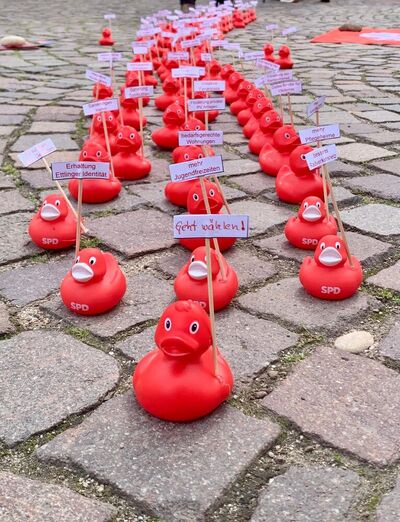 Da kam die Idee auf, die Ziele und Forderungen in Kurzform, „plakativ“ zu formulieren. Nach akribischer Vorbereitung der Aktion durch Beate Horstmann, Joachim Rutschmann und Kirstin Wandelt fanden sich neben der Hundertschaft von roten Enten am Nachmittag des Feiertages rund ein Dutzend Helferinnen und Helfer auf dem Marktplatz, allesamt SPD-Kandidatinnen und Kandidaten für Gemeinderat, Kreistag und Ortschaftsräte ein, die für sicheres Geleit und ungehindertes Fortkommen beim Erreichen des Rathauses sorgten.