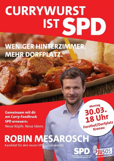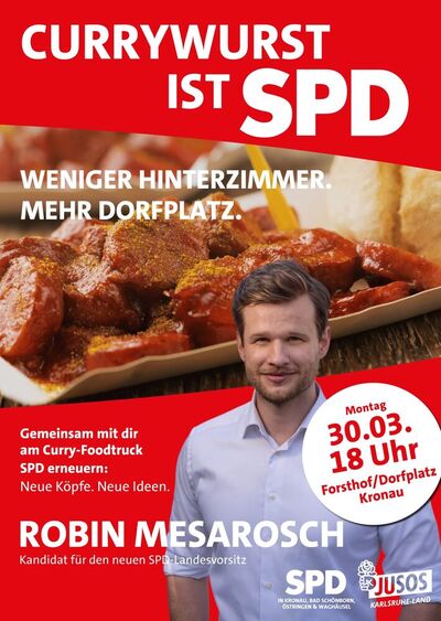 Wir laden am Montag, 30. März 2026 um 18 Uhr zu unserer offenen Veranstaltung „Currywurst ist SPD“ auf den Dorfplatz/Forsthof in Kronau ein. Gemeinsam mit den Jusos Karlsruhe-Land und den umliegenden SPD-Ortsvereinen wollen wir in lockerer Atmosphäre mit den Menschen vor Ort ins Gespräch kommen.