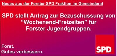 Die SPD Fraktion stellt den Antrag auf Bezuschussung von Wochenende-Freizeiten von Forster Jugendgruppen bzw. Wochenend-Freizeiten für Kinder und Jugendliche bis 18 Jahre. „Wochenend-Freizeiten“ beinhaltet alle Freizeiten, die länger als zwei Tage andauern.