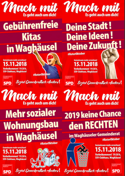 Im Oktober 2018 verschreiben sich die Waghäuseler Sozialdemokraten mehr denn je ihrer Grundfarbe „rot“. Unter dem Motto #roteroktober werden in zwei Phasen jeweils zwei Themen durch Plakate in der Großen Kreisstadt publik gemacht. „Mit dieser Aktion wollen wir den Fokus auf Themen lenken, denen unserer Meinung nach mehr öffentliche Aufmerksamkeit zukommen sollte“ so die Ortsvereinsvorsitzenden Ulrike Lechnauer-Müller und Sebastian Emmert.