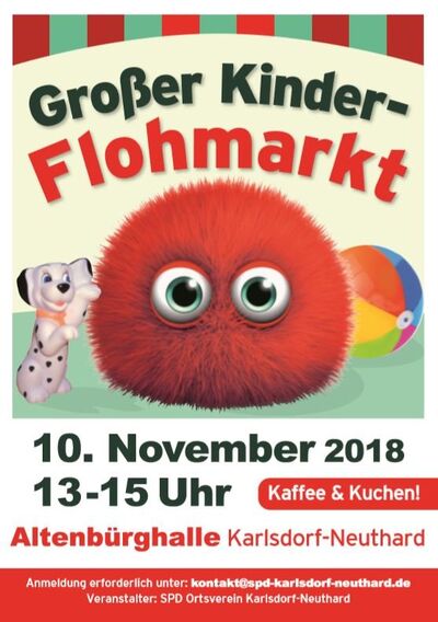 Am Samstag, den 10. November 2018 findet von 13 - 15 Uhr zum 25. Mal unser großer Flohmarkt von Kinder für Kinder in der Altenbürghalle statt. Anmelden kann man sich unter kontakt@spd-karlsdorf-neuthard.de oder Telefon 07251 / 349955.