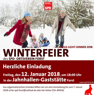 Es ist eine lang gepflegte Tradition der Forster SPD, das neue Jahr mit einer Winterfeier zu beginnen. In diesem Jahr feiert der SPD-Ortsverein das 110-jährige Bestehen. Die Forster SPD ist damit die älteste Forster Partei. Am Freitag, den 12. Januar lädt der Ortsverein um 18 Uhr ins Restaurant Jahnhalle ein. Im Licht des Kerzenscheins wird der Vorsitzende auf das vergangene Jahr zurückblicken und die Schwerpunkt im Jubiläumsjahr skizzieren. Viele Menschen bewegt die aktuelle Entwicklung in Berlin und damit verbunden, eine mögliche Neuauflage der Großen Koalition. Auch darüber wird die SPD mit ihren Mitgliedern und allen interessierten Gäste sprechen.