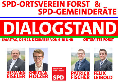 Am kommenden Samstag, den 23. Dezember werden Mitglieder der SPD und der SPD-Gemeinderatsfraktion von 9 Uhr bis 10 Uhr in der Forster Ortsmitte für ein Jahresabschlussgespräch zur Verfügung stehen. Haben Sie Sorgen, Fragen oder Anregungen, so können Sie diese an diesem Tag sowie das ganze Jahr vortragen.