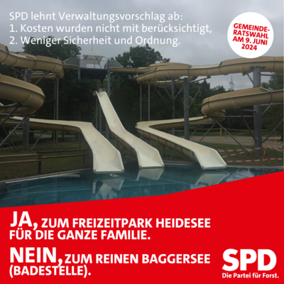 Aus dem zum Heidesee erstellten Gutachten geht hervor, dass der aktuelle Betrieb nicht rechtmäßig organisiert ist. Als Alternativen werden für die Badesaison 2024 drei Möglichkeiten benannt: Badestelle, Naturbad klein, Naturbad groß. Wir halten Möglichkeit „Naturbad, klein“ für am geeignetsten: Zum einen ist im Naturbadbetrieb durch die Badeaufsicht eine größere Badesicherheit gewährleistet. Im Badestellenbetrieb erfolgt die Nutzung des Sees auf eigene Gefahr, dies halten wir für problematisch. Wir wünschen uns nicht nur Rechtssicherheit, sondern Rechtssicherheit UND Badesicherheit! Wir sehen es auch nicht, dass die Gemeinde durch den Betrieb des Heidesees als Badestelle eine große Kostenersparnis erwirkt.