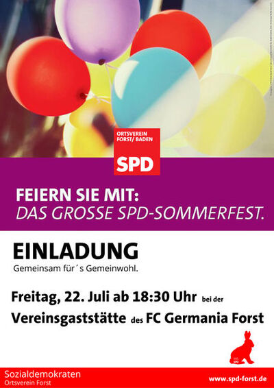 Am Freitag, den 22. Juli findet um 18:30 Uhr das traditionelle Sommerfest des SPD Ortsverein Forst in der Vereinsgaststätte des FC Germania Forst statt. Hier möchten wir gemeinsam gesellige Stunden miteinander verbringen sowie den Start in die Sommerpause einläuten. Wie in den vergangenen Jahren gibt es auch dieses Jahr Schnitzel und ein großes Salatbüfett. Für das Salatbüfett bitten wir wieder um zahlreiche Salatspenden.