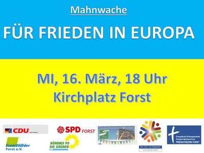 Für Mittwoch, 16. März, ruft ein Bündnis aus Parteien, Kirchen und Vereinen um 18 Uhr zu einer Mahnwache "Kommt zusammen. Für Frieden in Europa." auf dem Forster Kirchplatz auf.