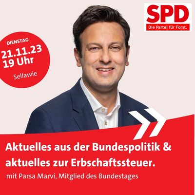 Der Karlsruher SPD-Bundestagsabgeordnete Parsa Marvi, der u.a. ordentliches Mitglied im Finanzausschuss des Deutschen Bundestags ist, wird am Dienstag, 21. November, um 19 Uhr im Sellawie in Forst zu aktuellen bundespolitischen Themen sprechen sowie über die Notwendigkeit einer Reform der Erbschaftssteuer. Gemeinsam mit anderen SPD-Abgeordneten hatte Parsa Marvi Anfang 2023 einen Beitrag zur Reform der Erbschaftssteuer verfasst und hier bundesweites interesse geweckt.