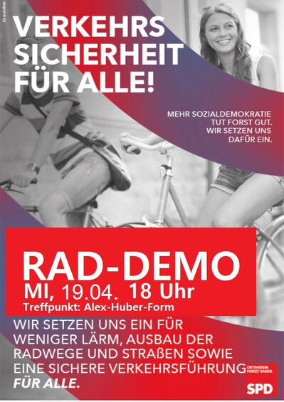 Wir rufen am Mittwoch, 19. April, um 18 Uhr zu einer Rad-Demo “Critical Mass” in Forst auf. Treffpunkt ist um 18 Uhr vor dem Alex-Huber-Forum. Anschließend fahren wir gemeinsam durch Forst. Gegen 18.30 Uhr werden wir in der Forster Ortsmitte eintreffen. Das Ende der Veranstaltung ist um 18.45 Uhr geplant. Unterstützen Sie die Forderung und nehmen Sie mit Freunden und Bekannten an der ersten Forster Rad- Demo “Critical Mass” teil.
