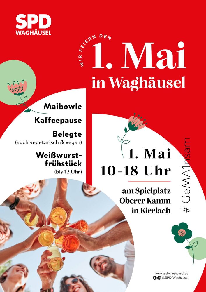 Endlich wieder! Wir feiern den Tag der Arbeit mit unserem traditionellen Maifest. Diesmal laden wir an die Dorfmitte „Oberer Kamm“ in Kirrlach, Webeschreibung siehe unten) statt. Mit dem Maifest begrüßen wir nicht nur den Frühling, sondern erinnern daran, wie wichtig Solidarität gerade heute ist.